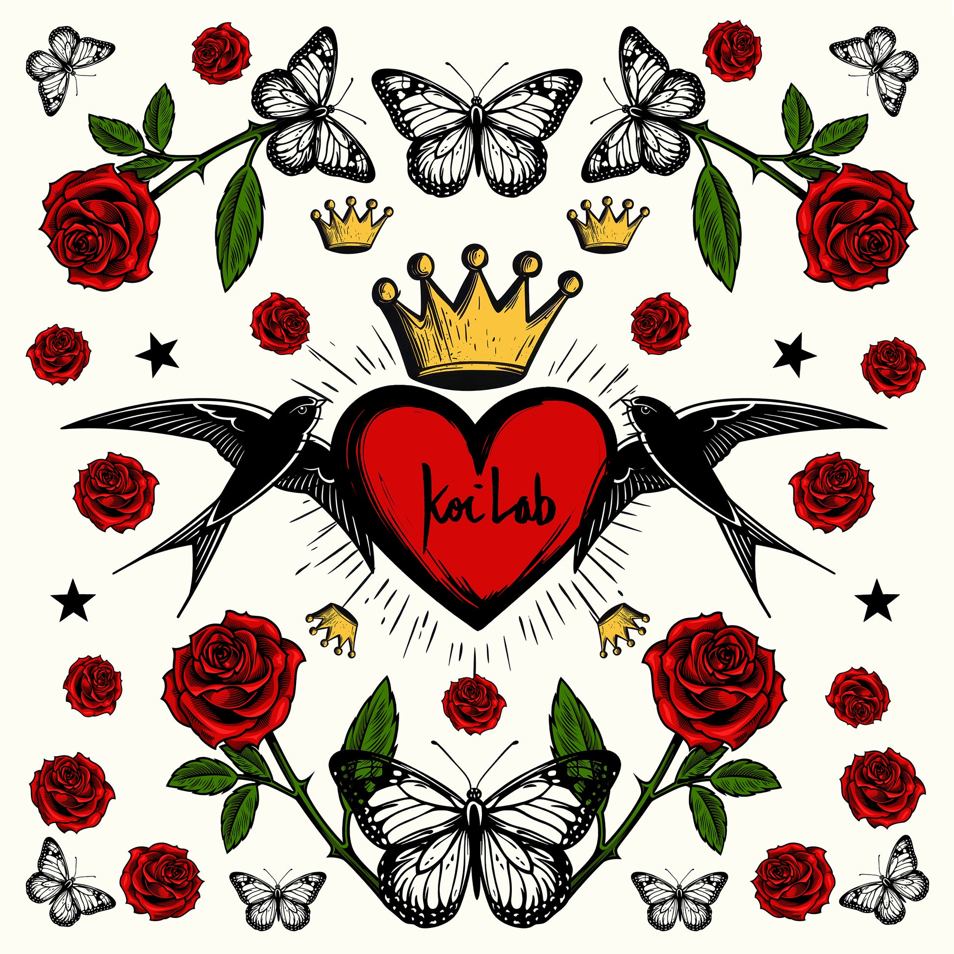 Un corazón rojo brillante, coronado de oro y acompañado por golondrinas, rosas y mariposas que lo resguardan como símbolo de poder, amor y libertad.