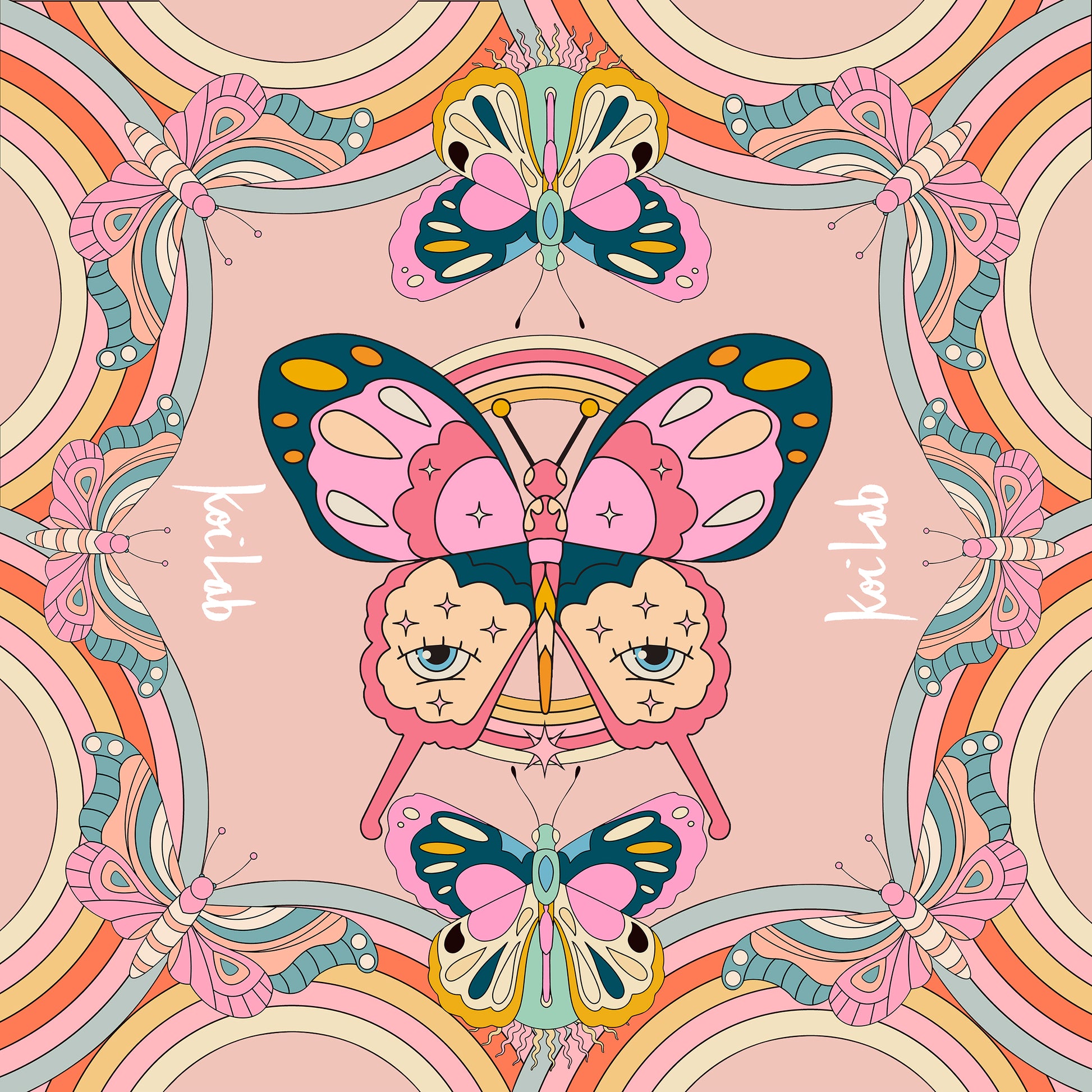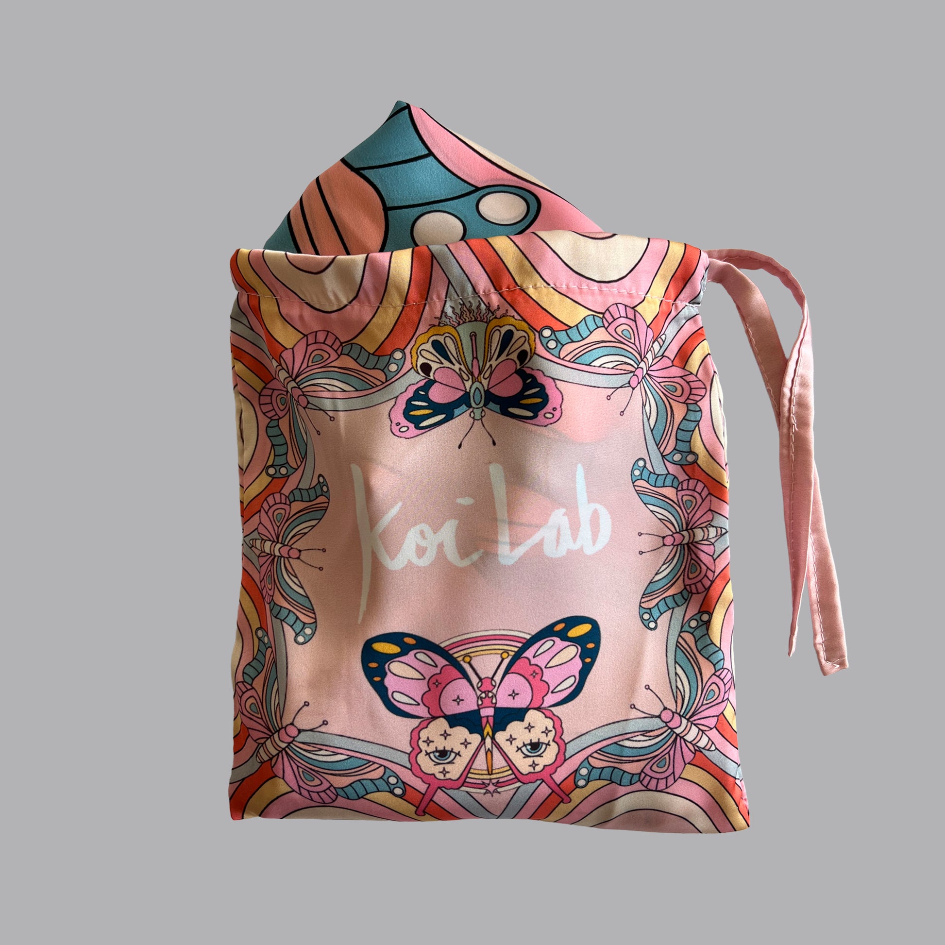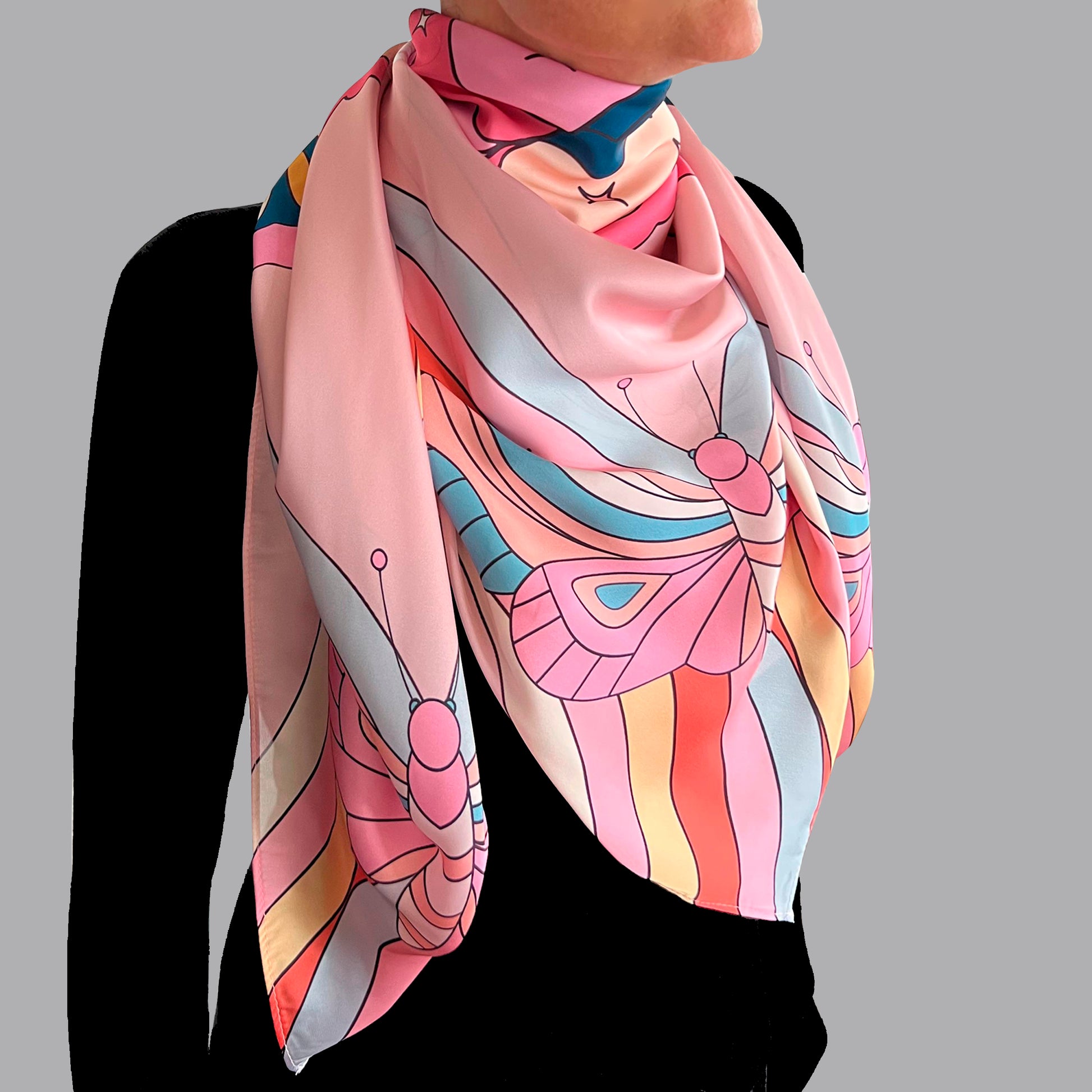 Mariposas que observan, sienten y se expanden entre curvas psicodélicas, ojos que despiertan y colores que iluminan. Un pañuelo para recordar que estás en movimiento, que puedes renacer cuantas veces quieras.